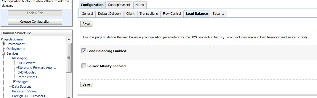 In Load Balancing Enabled, specify whether a server instance that is load balancing consumers or producers across multiple member destinations in a distributed destination will first attempt to load balance across any other physical destinations that are also running on the same instance. You can turn off load balancing if you have applications that use distributed destinations to distribute or balance their producers and consumers across multiple physical destinations, but do not want WebLogic Server to make a load balancing decision each time a message is produced.