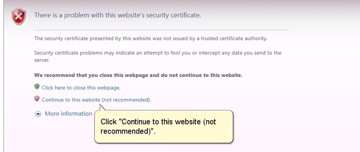 3.Click the option “Continue to this Website(not recommended)”.